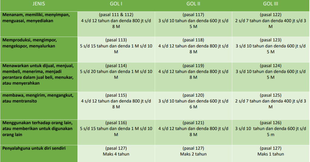 Peraturan hukum yang mengatur mengenai pemberian sanksi atau pidana terhadap penyalahgunaan narkotika diatur dalam UU No. 35 tahun 2009 tentang Narkotika. Berikut matriks tentang jenis pelanggaran dan ancaman pidana yang termuat secara lengkap dan terinci sebagaimana ketentuan dari UU No. 35 Tahun 2009 tentang Narkotika: Selain daripada terlampir dalam tabel, pada pasal 127 ayat (2) dijelaskan bahwa dalam memutus perkara sebagaimana dimaksud pada ayat (1), hakim wajib memperhatikan ketentuan sebagaimana dimaksud dalam pasal 54, pasal 55, dan pasal 103. Kemudian dijelaskan pada ayat (3) dalam hal penyalah guna sebagaimana dimaksud pada ayat (1) dapat dibuktikan atau terbukti sebagai korban penyalahgunaan narkotika, penyalah guna tersebut wajib menjalani rehabilitasi medis dan rehabilitasi sosial. Orang tua dari pecandu dewasa dan anak wajib lapor ke Puskesmas/Rumah Sakit/Lembaga Rehabilitasi (Pasal 55 ayat (1) dan (2)) sesuai dengan Peraturan Menteri Kesehatan No. HK.02.02/Menkes/615/2016 tentang Institusi Penerima Wajib Lapor. Orang tua atau wali dari pecandu dewasa dan anak yang tidak lapor dikenai sanksi kurungan 6 bulan sebagaimana dijelaskan dalam pasal 128 ayat (1). Bagi pecandu dewasa wajib lapor ke Puskesmas/Rumah Sakit/Lembaga Rehabilitasi (Pasal 55 ayat (2)) sesuai dengan Peraturan Menteri Kesehatan No. HK.02.02/Menkes/ 615/2016 tentang Institusi Penerima Wajib Lapor. Bagi pecandu dewasa yang tidak lapor dikenai sanksi kurungan 6 bulan sebagaimana dijelaskan dalam pasal 134 ayat (1). Post Views: 47 Post navigation Narkotika Ada Golongannya? NARKOTIKA: Yakin Masih Mau Coba?