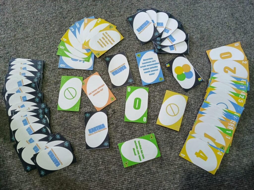 Game KARTIKA “Kartu Anti Narkotika” merupakan sebuah permainan yang terinspirasi dari game yang sering dimainkan oleh pelajar yaitu UNO. permainan kartu yang dimainkan secara bergiliran untuk menjadi pemain pertama yang menghabiskan semua kartu di tangannya. Permainan ini menggunakan kartu khusus yang dicetak warna-warni dan bertuliskan angka. Namun pada game KARTIKA, di dalam kartu tersebut ditambah pertanyaan-pertanyaan yang harus dijawab oleh pemain setelahnya apabila ia mengeluarkan kartu berisi pertanyaan tersebut. Apabila pemain setelahnya tidak dapat menjawab pertanyaan dari kartu tersebut, maka ia harus mengambil kartu dare (tantangan) dan melaksanakan tantangannya. Tujuan dari permainan ini adalah untuk menarik minat para generasi pelajar agar dapat menambah pengetahuan dan memahami narkotika melalui permainan yang sering mereka mainankan