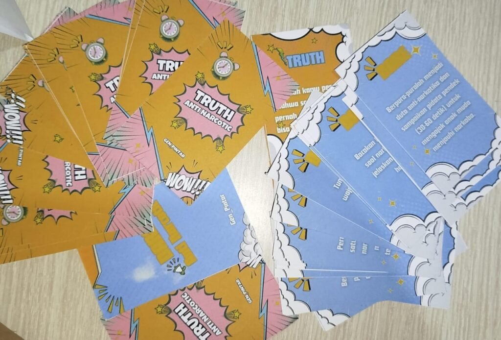 Game Truth or Dare Paham Narkotika merupakan sebuah permainan yang terinspirasi dari game yang sering dimainkan oleh para pelajar. Game ini berisi dua kartu yaitu kartu kebenaran dan kartu tantangan. Pada game ini, pertanyaan kebenaran dan tantangan dirubah menjadi pertanyaan atau tantangan seputar narkotika. Cara memainkannya adalah pemain melempar koin yang di kedua sisinya terdapat tulisan truth atau dare. Ketika pemain melempar koin dan mendapatkan truth, maka ia harus menarik satu kartu bewarna orange dan menjawab pertanyaan dengan jujur, begitupun sebaliknya apabila pemain mendapatkan tulisan dare, maka pemain harus mengambil satu kartu tantangan kemudian menyelesaikan tantangan tersebut.